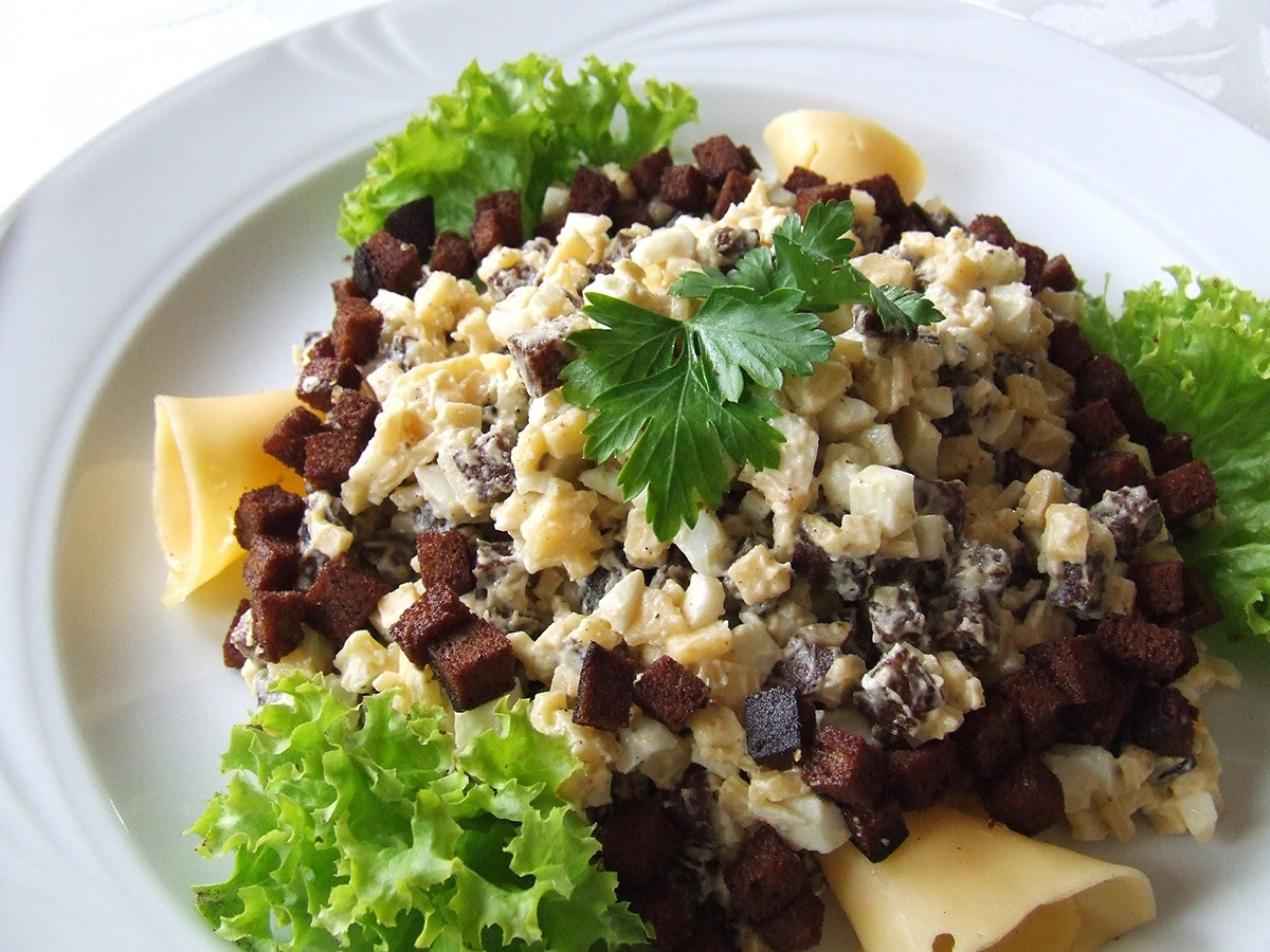 | Sałatka litewska Astra Podsmażany litewski razowy chleb natarty czosnkiem, jajko gotowane, ser, sos (czas oczekiwania ok. 10 minut) |