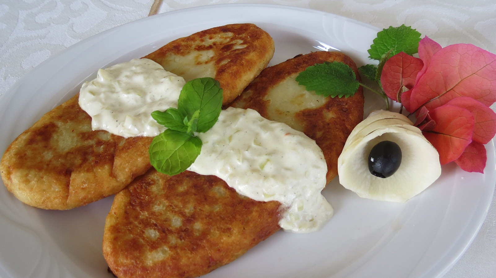 | Žemaičių blynai Kotlety ziemniaczane, nadziewane mięsem polane sosem śmietanowym, lub z kapustą podane ze smażoną cebulką (czas oczekiwania ok. 30 minut) |