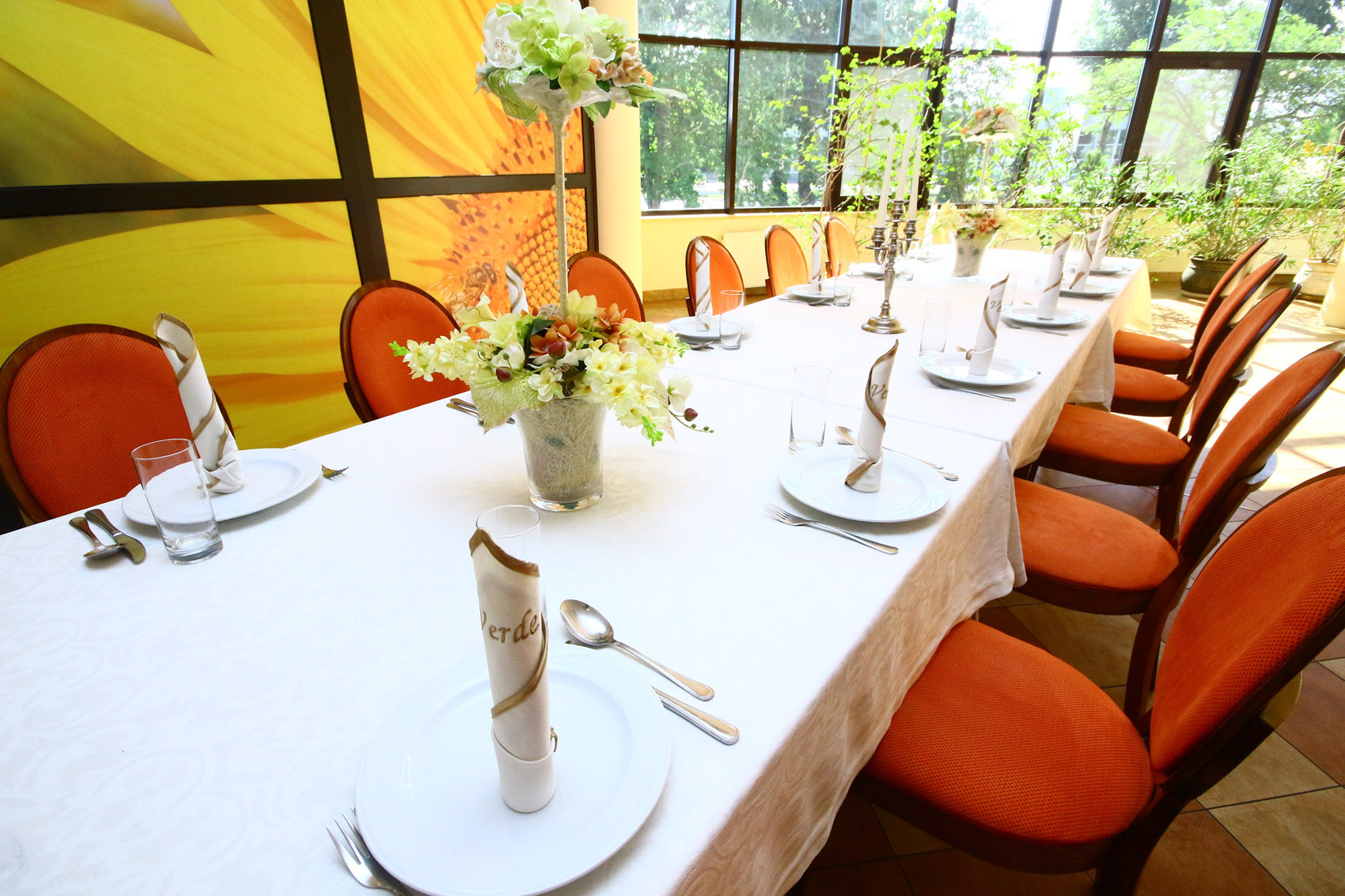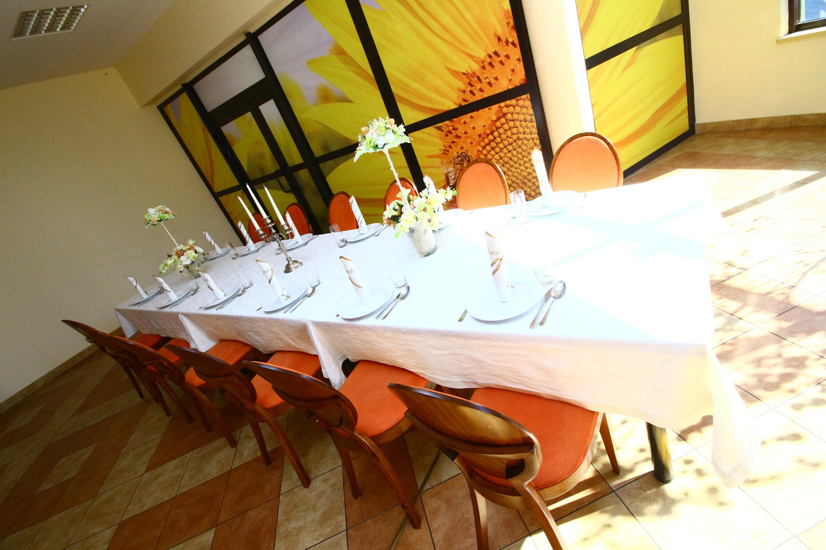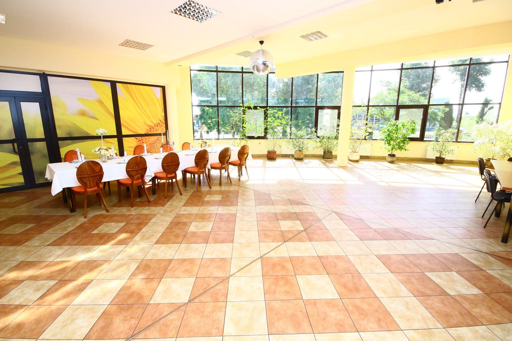Sala parterowa jest salą wielofunkcyjną. Może służyć Państwu do zorganizowania imprezy okolicznościowej, konferencji, prezentacji produktów lub pokazów artystycznych. Wysokie sufity, kolumny, łukiem oszklone okna stanowią atuty Sali. Sala znajduje się na parterze co stanowi jej dodatkowy atut. Przed wejściem do Sali parterowej znajduje się duży hol wyposażony w meble wypoczynkowe. W holu znajduje się bezpośrednie wejście do pokoju hotelowego.