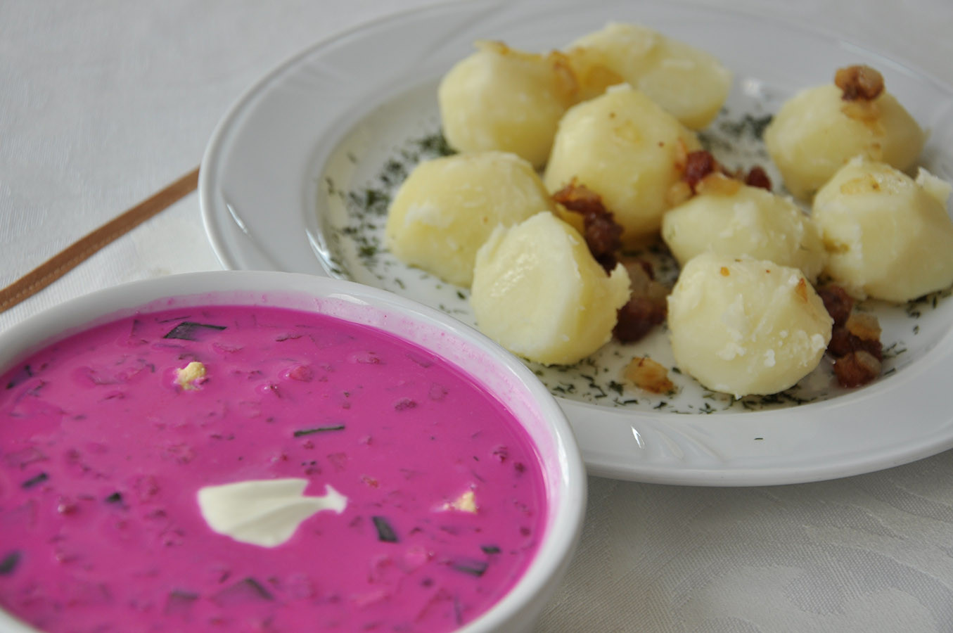 | Chłodnik litewski (sezonowo maj - wrzesień) Zimny barszcz pochodzenia litewskiego, podany z gotowanymi ziemniakami i skwarkami. (czas oczekiwania ok. 10 minut) |